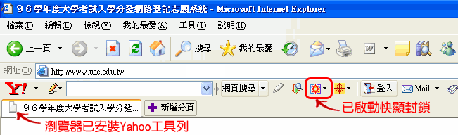 由於部份瀏覽器本身或外掛軟體,以及部份防毒、反廣告、反間諜或防火牆軟體,具有「快顯視窗封鎖」功能,使用此功能將無法順利進入網路登記志願系統。考生進行網路登記志願前,務必先行關閉快顯視窗封鎖功能,以利進行網路登記志願。